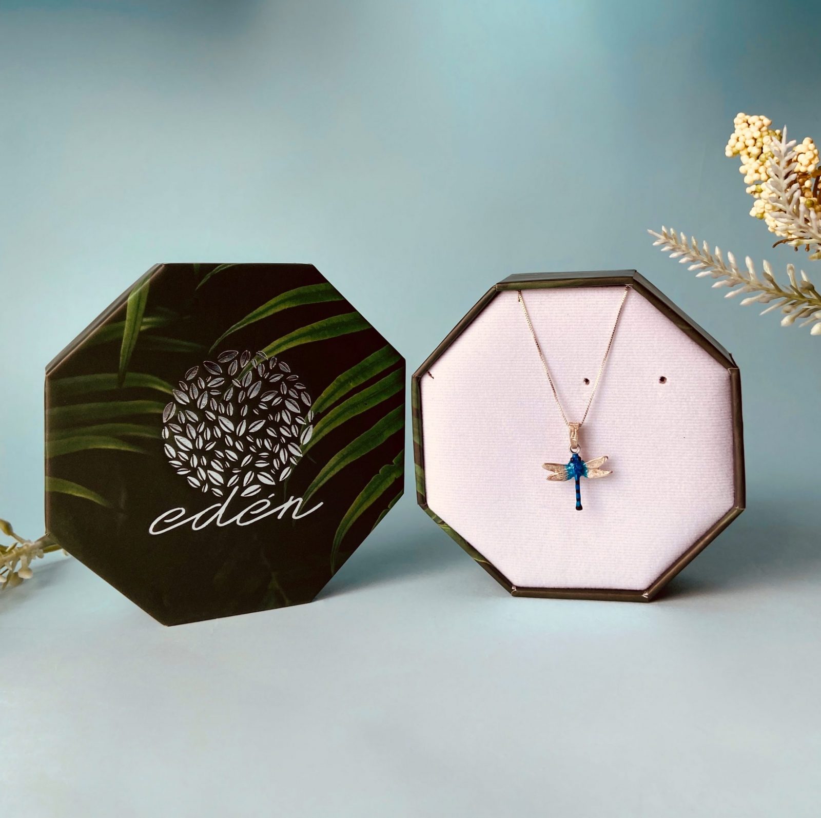 Cuando llevas una libélula edén, la pureza va contigo, debido a la transparencia en sus alas y sus colores fuertes en el torso, y lo muestran a los que quieres para que vean la pureza de nuestra existencia.